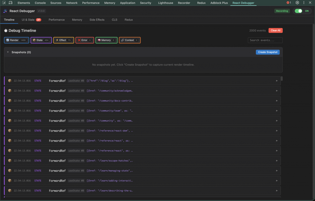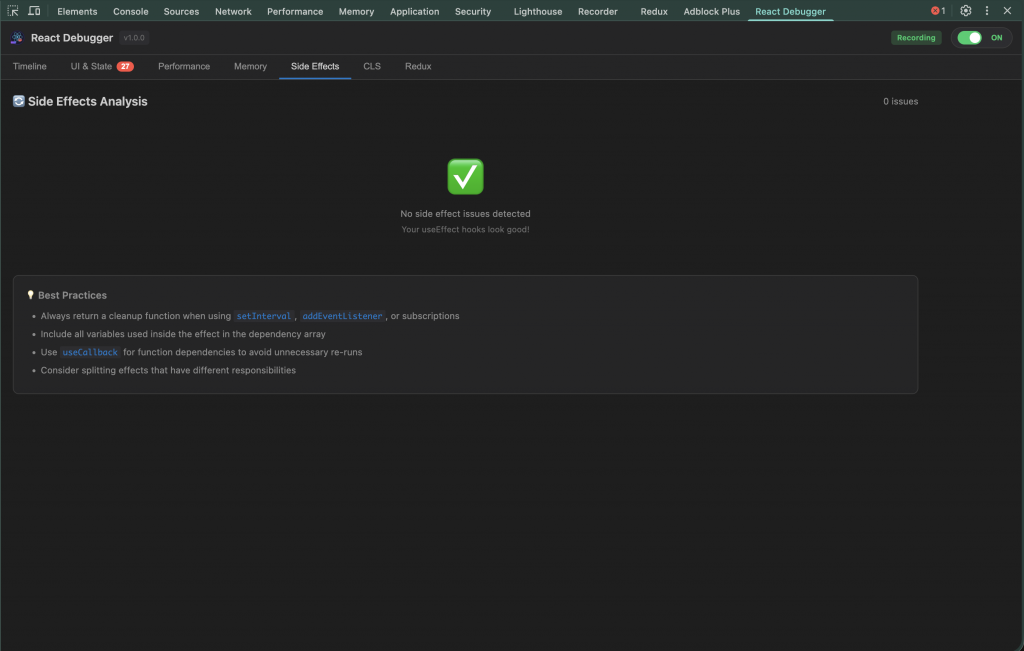 Tôi xây React Debugger dưới dạng extension DevTools, xuất hiện như một tab “React Debugger”. Nó không dừng ở việc ném cảnh báo, mà tạo nên hệ quan sát đầy đủ.