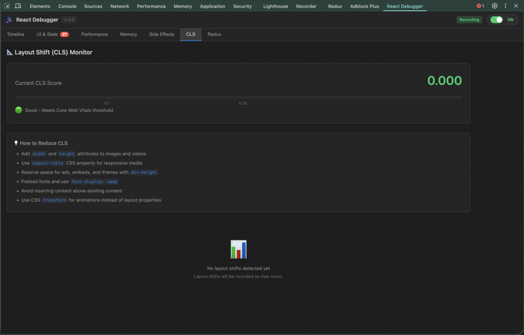 React cộng Chrome API, WebSocket, timers… nếu thiếu cleanup, heap memory tăng đều, app giật. DevTools Memory view giúp đo snapshot nhưng khó thao tác liên tục. Layout shift (CLS) thì càng “căng”: biết có vấn đề, nhưng không biết element nào gây shift.